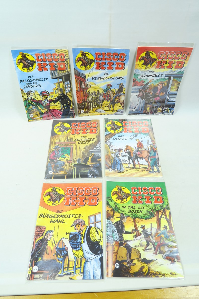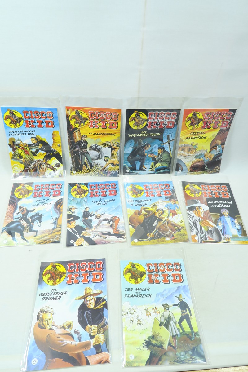 aus Sammlungsankauf: 25 Cisco Kid Comics des CCH Verlages in neuwertigem Zustand. Nr. 1-12,14,15,17-20,23,24,26-30. Alle Hefte sind in Comic-Hüllen, daher ggf. die Reflektionen auf den Fotos.