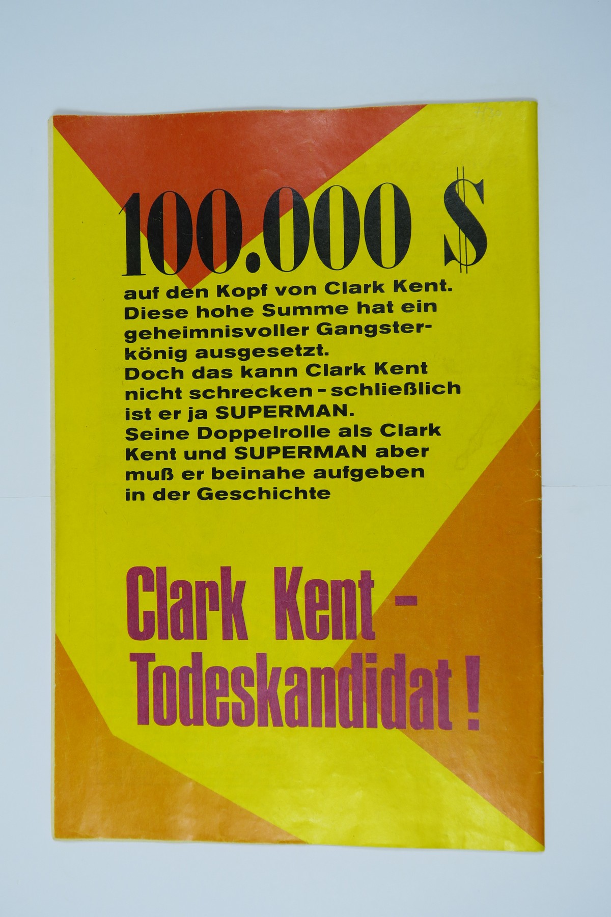 Das Heft ist im Zustand (2/2-3). Falzblitzer, leichte Bug- und Knickspuren am Cover, zarter Fleck auf der Rückseite.