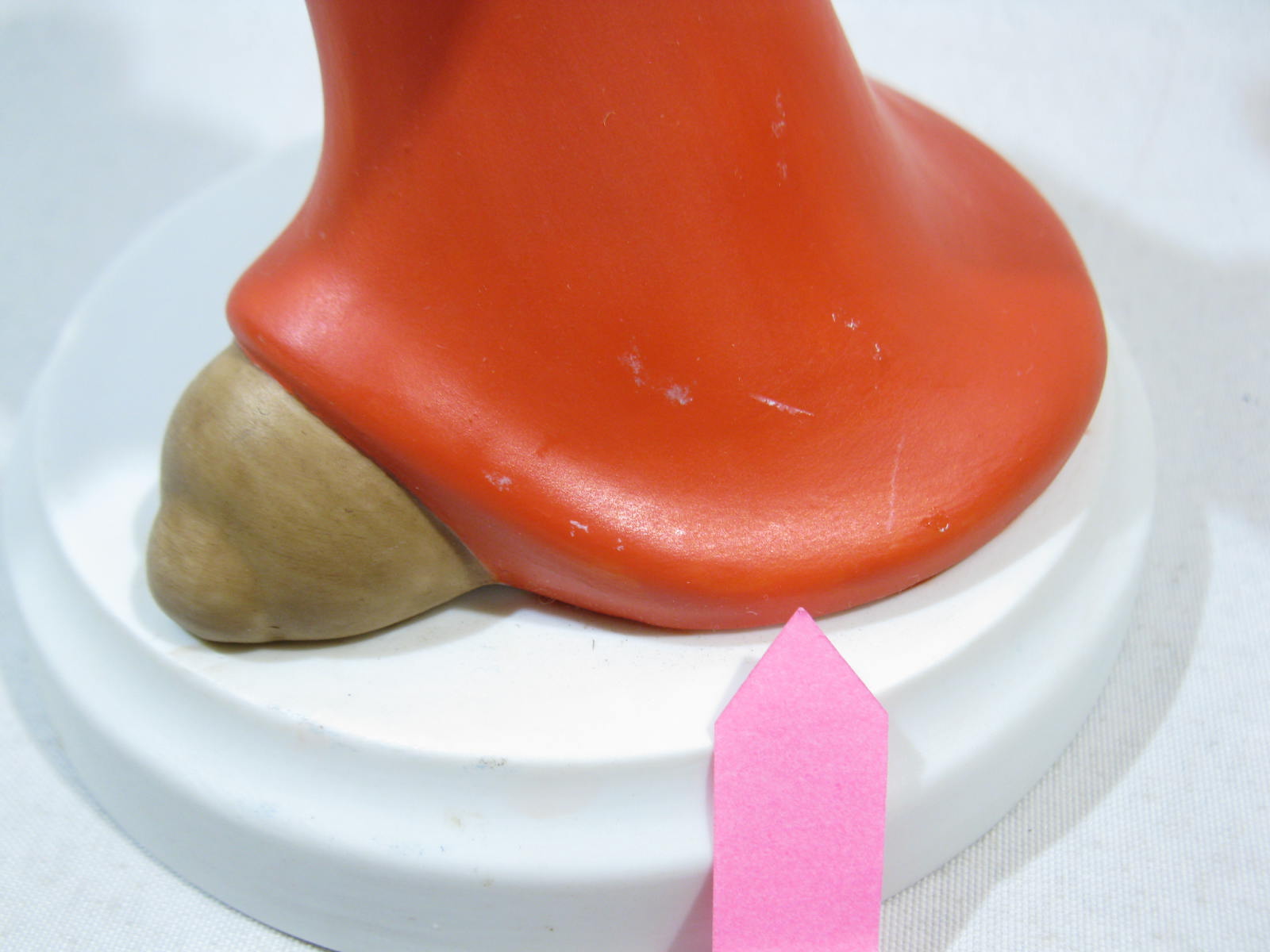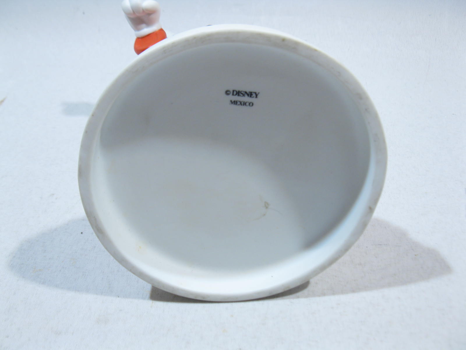 der Sockel hat einen Durchmesser von 11 cm, die Figur ist 19 cm hoch. Auf der Unterseite steht "Disney Mexico". Sehr guter Zustand, außer ein kleiner Farbabrieb an der markierten Stelle.