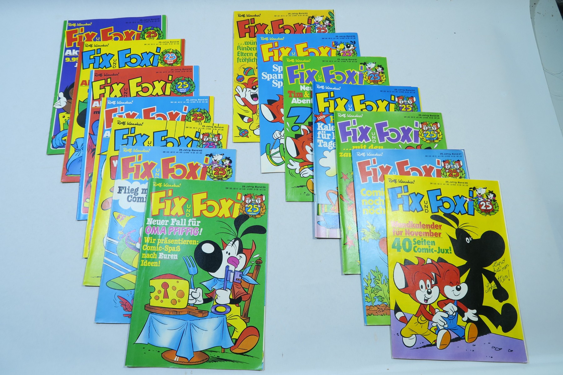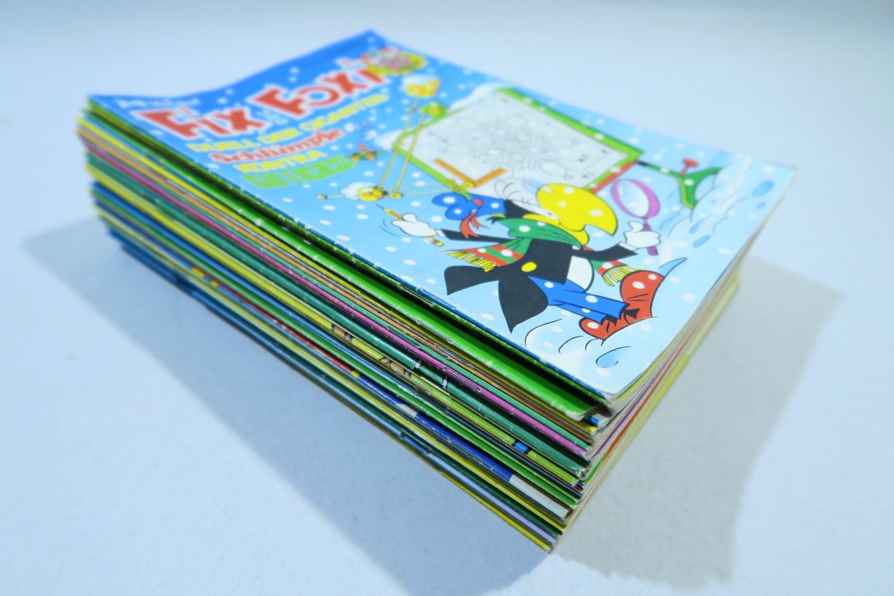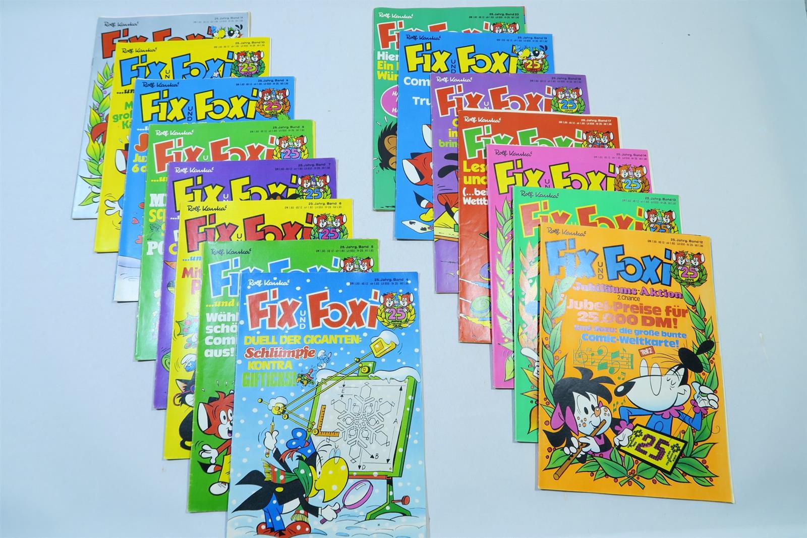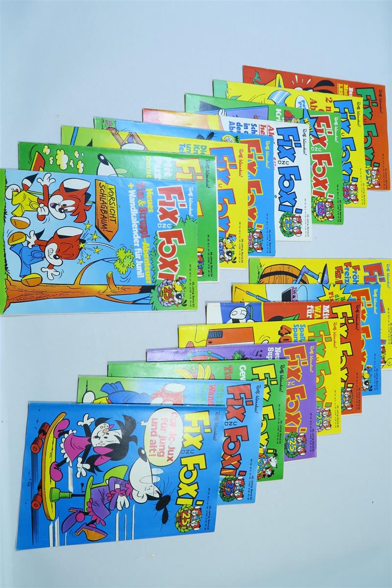 ein schönes Konvolut alter Fix und Foxi Hefte aus dem 25. Jahrgang, es fehlen nur 7 Nummern zum kpl. Jahrgang. Die Hefte haben leichte Gebrauchsspuren, durchschnittlicher Zustand (1-2/2). Ein paar Ausreißer nach oben wie nach unten. Bei einigen Heften wurden die Tim-und-Struppi-Seiten herausgenommen und separat geklammert. Bei einigen Heften fehlt die Mittelseite/Poster, die Comicstory ist aber komplett. Somit ein klassisches Lesekonvolut.
