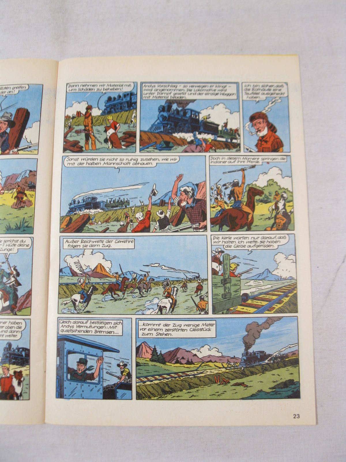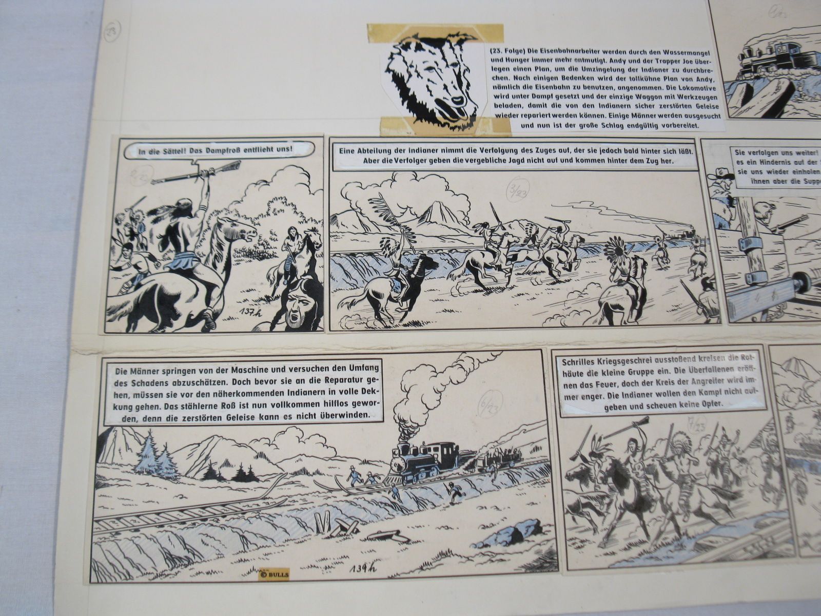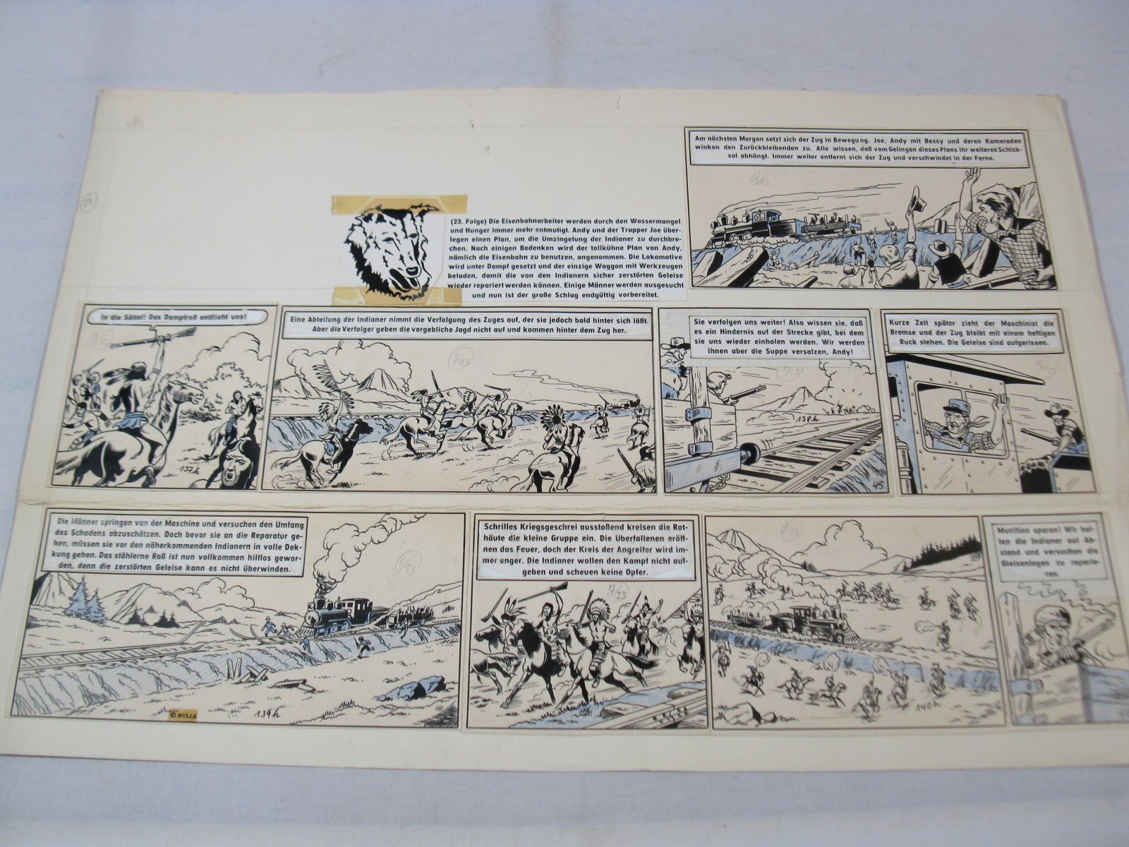 Der Bastei-Verlag hat dann Mitte der 60er Jahre die Panels ins Hochformat ummontiert. Die hier vorliegende Seite erschien in Bessy Nr. 18 "Kampf um den Pazifik-Expreß". Leicht abgewandelt, so wurden die letzten drei Panels in der Bastei-Ausgabe nicht gedruckt. Vielleicht bedingt durch das in Heft 18 enthaltene Poster, für das ja zwangsläufig vier Comicseiten zum Opfer fielen. Zu sehen auch in der beigefügten Farbkopie der entsprechenden Seite aus dem Bastei-Heft.