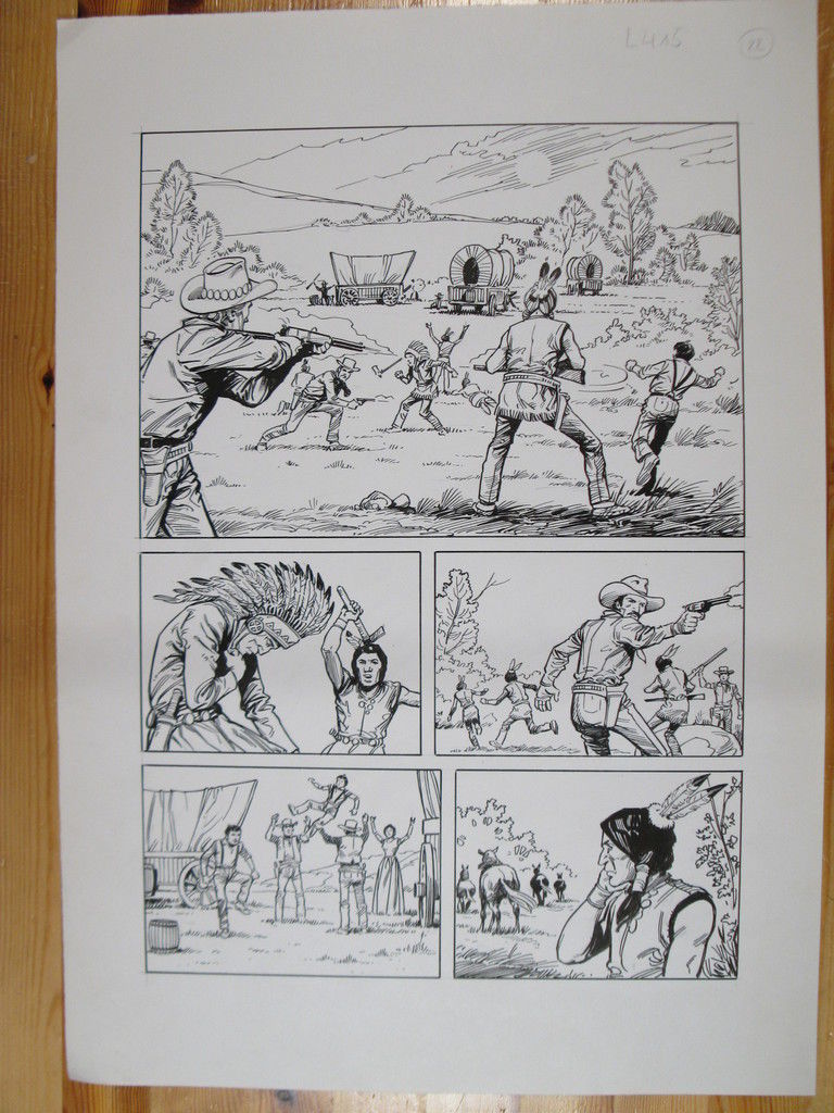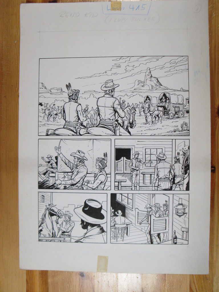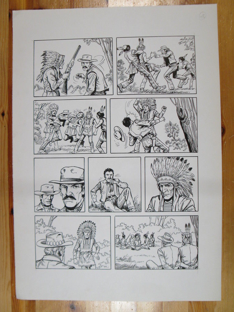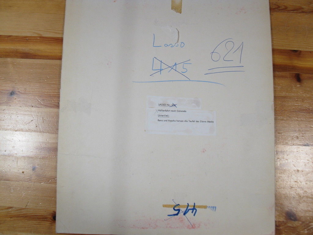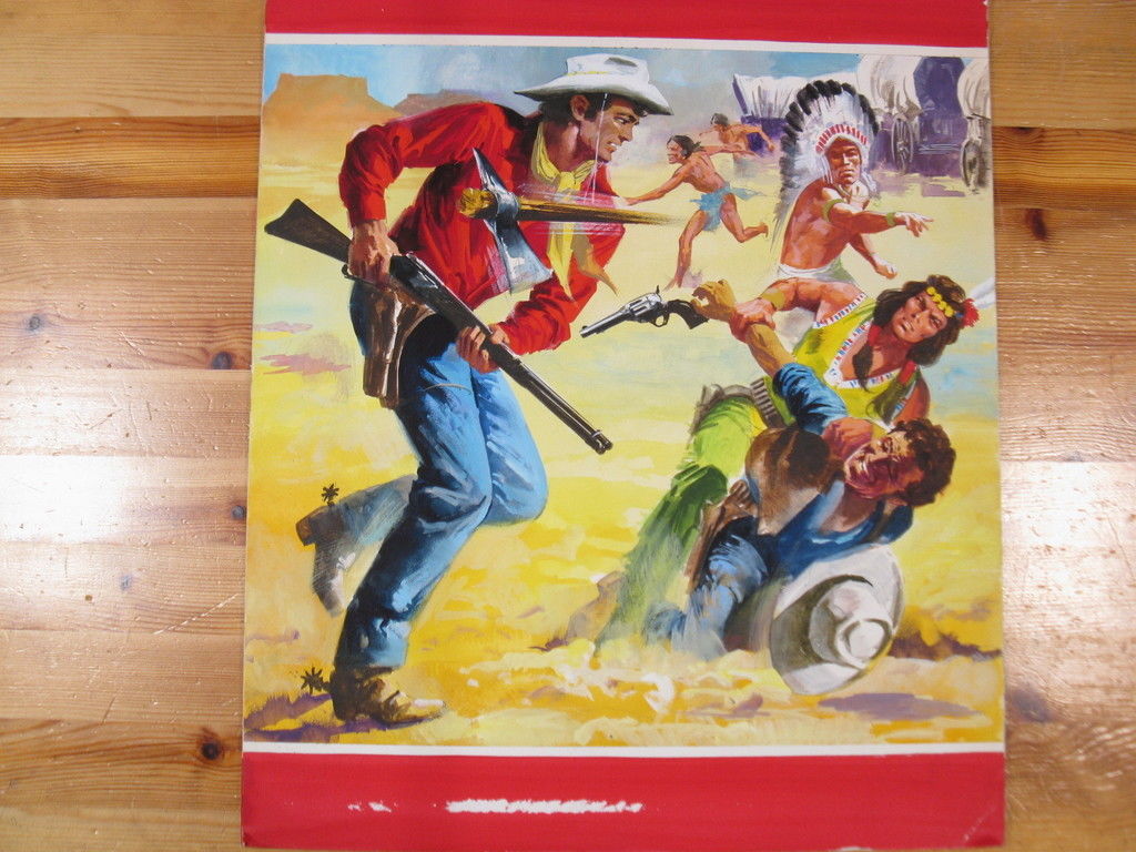 Angeboten werden hier das Original-Cover sowie alle 27 Originalseiten (!!!) aus dem Lasso-Heft Nr. 415 (bzw. 621, unter dieser Nummer erfolgte damals ein Heftnachdruck) mit dem Titel "Höllenfahrt nach Colorado", veröffentlicht am 25.6.1976 im Bastei-Verlag. Kartonformat des Covers ca. 43 x 37 cm (Covermotiv ca. 35 x 37 cm), Blattformat der Seiten ca. 50 x 35 cm. Auf den Seiten 4,11,20 und 22 befinden sich Panels, die im Bastei-Heft der Werbung zum Opfer gefallen sind (Marken Paul lässt grüßen...). Aus demselben Grunde sind die Seiten 8,13 und 23 im Heft NICHT abgedruckt. Nur auf diesen Originalseiten lässt sich somit die ursprünglich konzipierte Story erleben! Auf dem unteren roten Rand des Covers ist ein waagrechte Abrißspur (vielleicht von entferntem Klebefilm?) sowie ein Knick an der rechten unteren Ecke zu sehen. Die linke untere Ecke ist leicht gestaucht. All dies betrifft NICHT das Bildmotiv, dieses ist in sehr gutem Zustand. Ebenso gut erhalten sind die 27 Comicseiten. Darauf sind vereinzelt die damaligen Arbeitsspuren in Form von Bleistift- bzw. blauem Buntstiftnotizen zu erkennen. Einzelne Originalseiten werden immer wieder einmal angeboten. Auch einzelne Lasso-Cover tauchen von Zeit zu Zeit auf dem Markt auf. Aber ein COVER MIT ALLEN ZUGEHÖRIGEN SEITEN ist sehr sehr schwer zu finden! Mit diesen Originalseiten erwerben Sie ein großes und seltenes Stück Comic-Kunst, das i-Tüpfelchen für jede Comic- bzw. Lasso-Sammlung! Der Versand erfolgt als versichertes Wertpaket! Please ask for an english description, if neccessary.