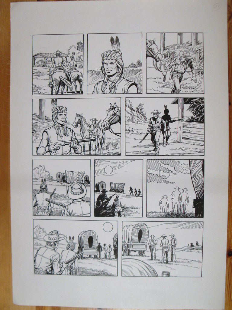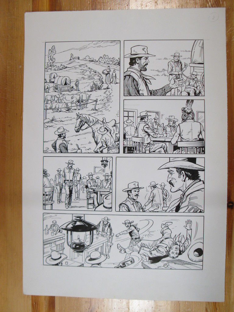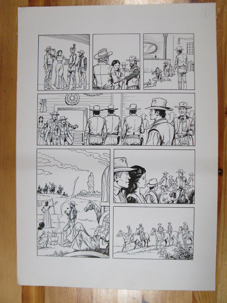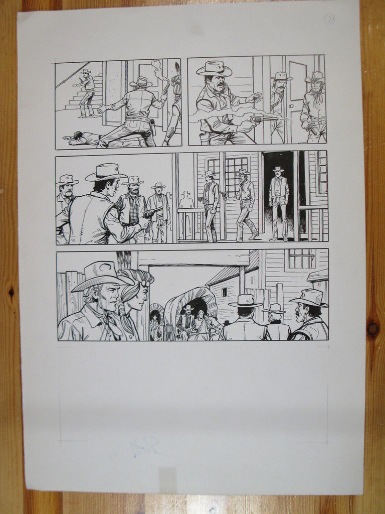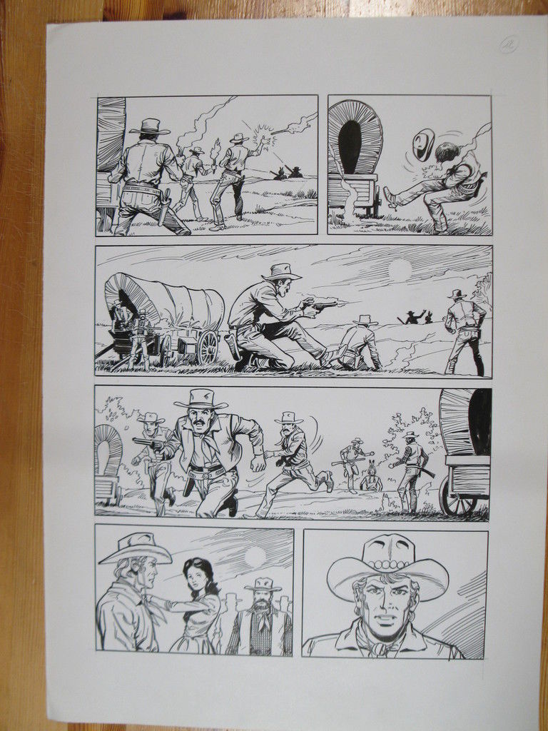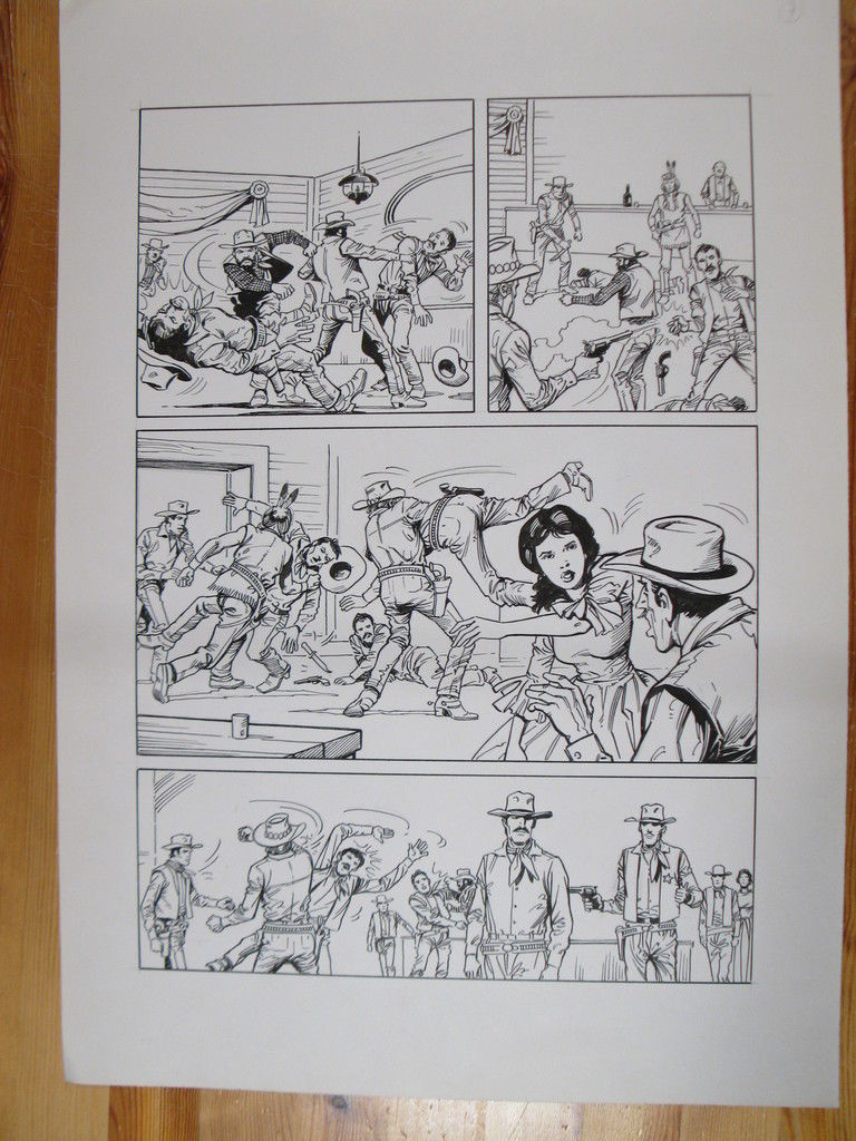 Angeboten werden hier das Original-Cover sowie alle 27 Originalseiten (!!!) aus dem Lasso-Heft Nr. 415 (bzw. 621, unter dieser Nummer erfolgte damals ein Heftnachdruck) mit dem Titel "Höllenfahrt nach Colorado", veröffentlicht am 25.6.1976 im Bastei-Verlag. Kartonformat des Covers ca. 43 x 37 cm (Covermotiv ca. 35 x 37 cm), Blattformat der Seiten ca. 50 x 35 cm. Auf den Seiten 4,11,20 und 22 befinden sich Panels, die im Bastei-Heft der Werbung zum Opfer gefallen sind (Marken Paul lässt grüßen...). Aus demselben Grunde sind die Seiten 8,13 und 23 im Heft NICHT abgedruckt. Nur auf diesen Originalseiten lässt sich somit die ursprünglich konzipierte Story erleben! Auf dem unteren roten Rand des Covers ist ein waagrechte Abrißspur (vielleicht von entferntem Klebefilm?) sowie ein Knick an der rechten unteren Ecke zu sehen. Die linke untere Ecke ist leicht gestaucht. All dies betrifft NICHT das Bildmotiv, dieses ist in sehr gutem Zustand. Ebenso gut erhalten sind die 27 Comicseiten. Darauf sind vereinzelt die damaligen Arbeitsspuren in Form von Bleistift- bzw. blauem Buntstiftnotizen zu erkennen. Einzelne Originalseiten werden immer wieder einmal angeboten. Auch einzelne Lasso-Cover tauchen von Zeit zu Zeit auf dem Markt auf. Aber ein COVER MIT ALLEN ZUGEHÖRIGEN SEITEN ist sehr sehr schwer zu finden! Mit diesen Originalseiten erwerben Sie ein großes und seltenes Stück Comic-Kunst, das i-Tüpfelchen für jede Comic- bzw. Lasso-Sammlung! Der Versand erfolgt als versichertes Wertpaket! Please ask for an english description, if neccessary.