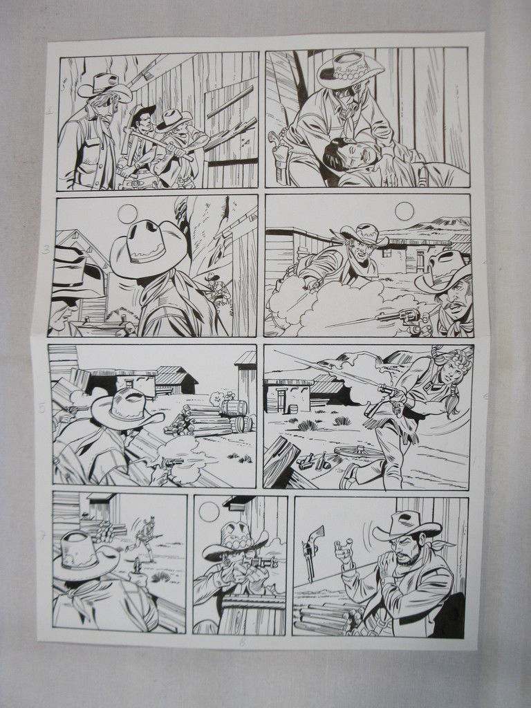 Angeboten wird hier die abgebildete Originalseite aus dem Lasso-Heft Nr. 557 ("Eine Falle für die Silber-Bande"), veröffentlicht im Bastei-Verlag. Format ca. 41 x 29 cm. Eine tolle action-geladene Szene! Sehr guter Zustand, mittig gefaltet. Mit dieser Originalseite erwerben Sie ein Stück Comic-Kunst, das i-Tüpfelchen für jede Comic- bzw. Lasso-Sammlung! english description on request!