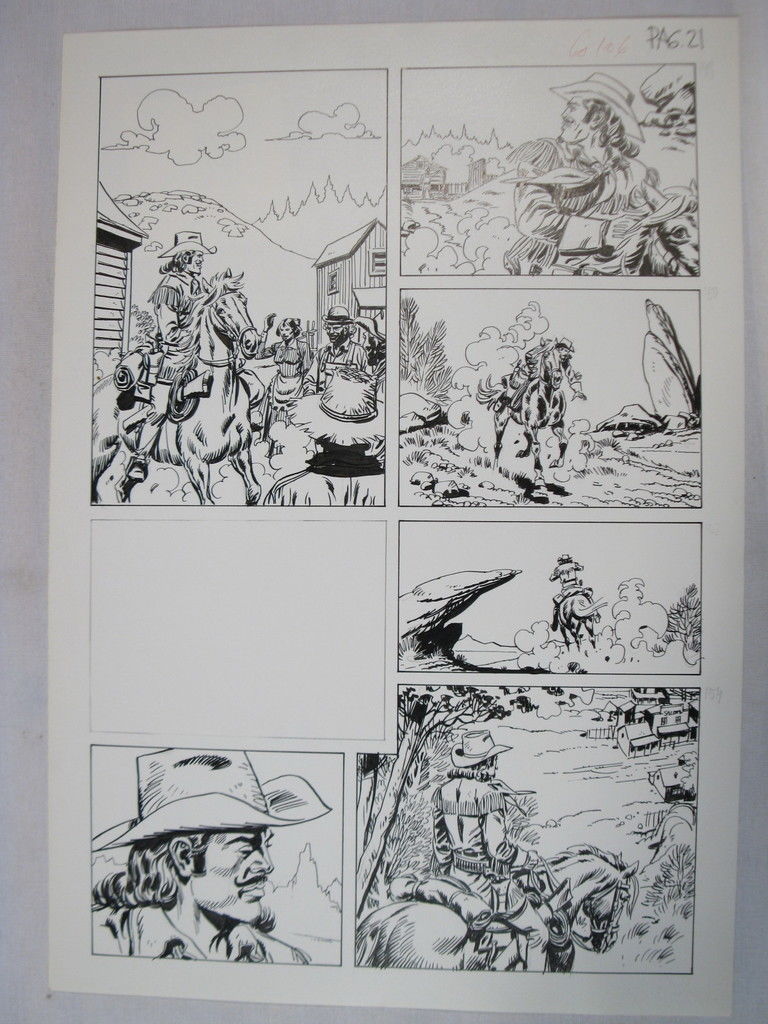 Angeboten wird hier die abgebildete Originalseite 21 von dem Buffalo Bill-Heft Nr. 448 ("Die Höllenbande von Nevada"),von Zeichner Alberto Sole, Format ca. 45 x 31 cm. Eine tolle Seite mit der Hauptperson in jedem Panel! Das besondere an dieser Seite: sie ist in dem gedruckten Bastei-Heft der Sugus-Werbung auf Heftseite 25 zum Opfer gefallen! Heftseite 24 endet mit der Aussage Buffalo Bills "ich folge ihm" und auf Seite 26 nach der Sugus-Werbung ist er bereits in "Stone Junction". Die Reise dahin zeigt die hier angebotene Orginalseite. Ein rares Stück Comic-Geschichte, welche leider auch die Kürzungspolitik von Bastei damals wiederspiegelt. Gerne auch Ankauf von Comic-Originalseiten bzw. -Cover, auch ein Tausch könnte denkbar sein. Fragen Sie nach!
